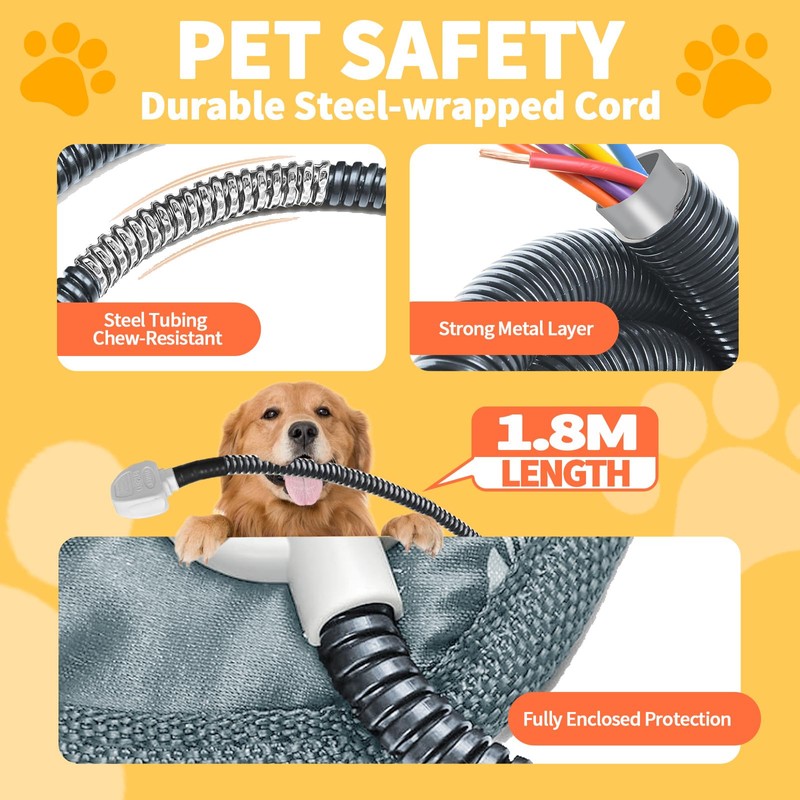 - 【Full Steel Tube Design】: Our heat resistant mat has 1.8m/5.9ft full steel tube wrapped around the power cord to prevent pets from tearing the cord, and an insulated junction box is injected into the dog mat to prevent leakage of electricity from the heat pads.