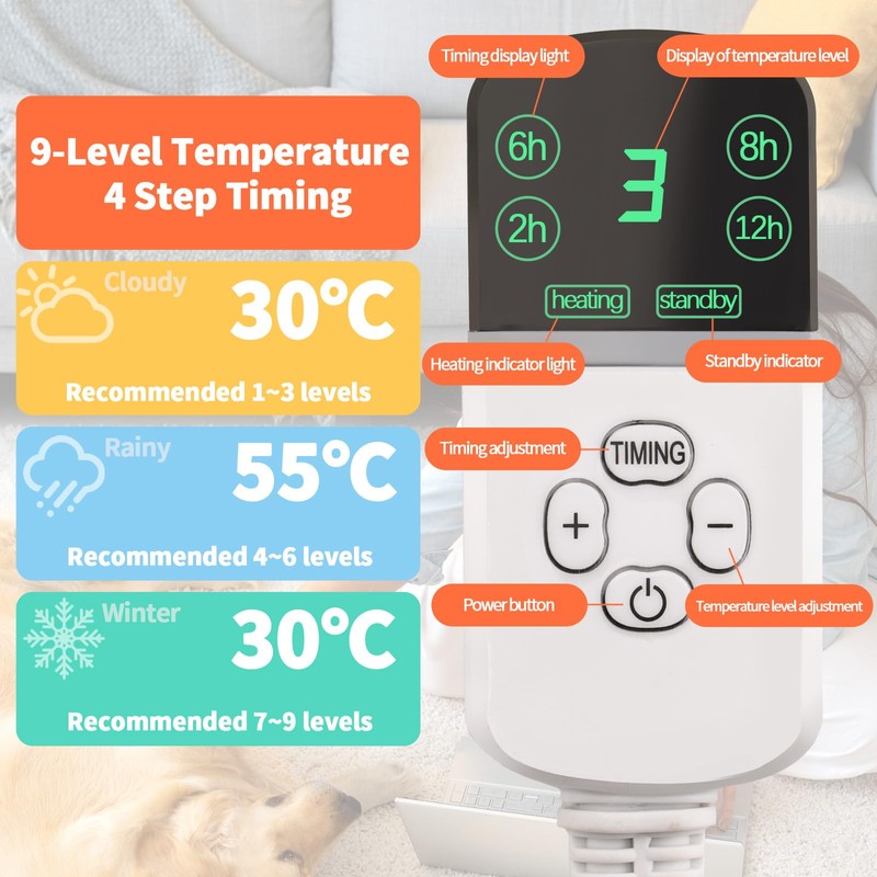 - 【9 Levels of Adjustable Temperature】: The pet electric blankethas 9 levels of adjustable temperature settings 35-50°C, you can adjust the temperature according to the need, dog, cat blanket has intelligent thermostat function, heat mat sense that the temperature is too high will automatically stop heating, will be Maintain a constant temperature to avoid the discomfort of hot and cold, whether you are looking for a gentle warmth or strong heating effect, you can easily find the most suitable for your pet that gear!