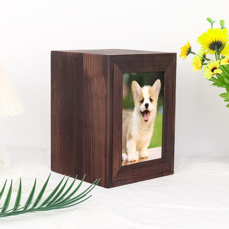 Pet Memorial Urn, Wooden Funeral Cremation Urn with Photo Frame Pine Wood Memorial Dog Urn Memorial Keepsake Memory Box Photo Box Pet Cremation Urn (Dark Brown)