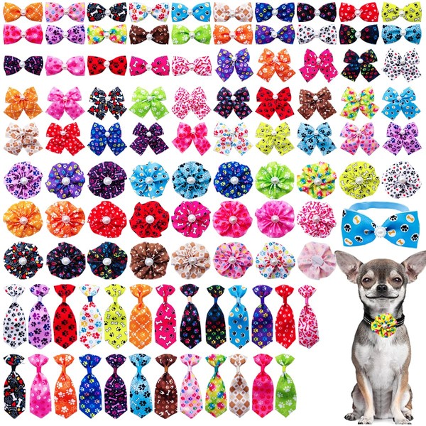 PET SHOW 100pcs Small Dog Bows Ties and Neckties Collar Bows Flowers Set 25 Paw Bone Patterns for Puppies Cat Dogs Grooming Accessories Birthday Party Costume for Groomer Pet Shop