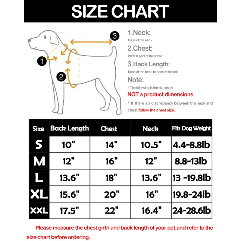 --XXL: back length, 17.5"; chest, 22"; neck, 16.4"; fits dog weight, 24-28.6 lb.