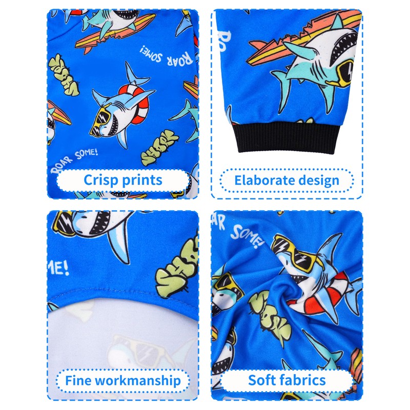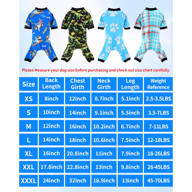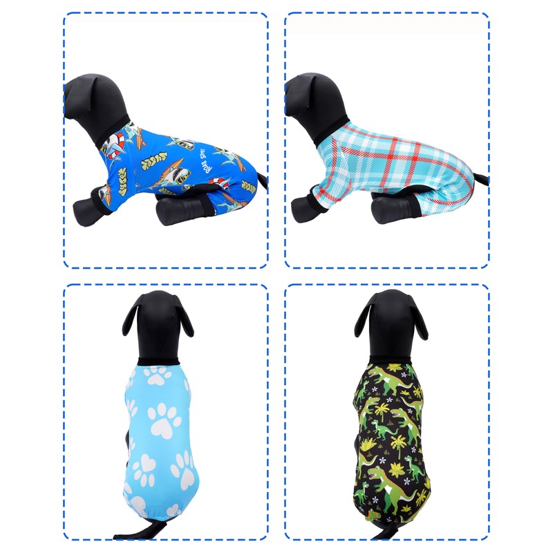 - Cute Blue PJs for Dogs Boy: This blue dog clothes set contains 4 pieces cute pajamas with plaid, paw, dinosaur and shark patterns, suitable for small, medium and large dogs male. It is adorable and eye-catching when your puppies wear it. They are good choice for the multi pet families