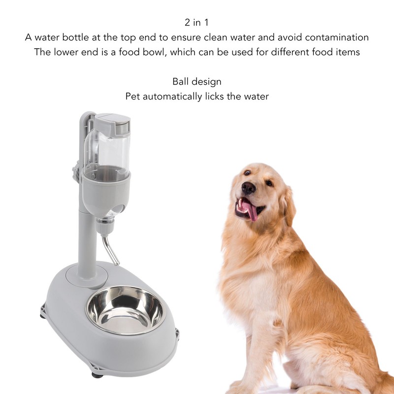 1、2 IN 1: Pet standing water dispenser bowl has a water bottle at the top end to ensure clean water and avoid contamination. The lower end is a food bowl, which can be used for different food items. 2、DETACHABLE: All parts of the pet automatic standing water feeder are detachable, so you don't have to pick up all the food when pouring and cleaning, which makes it easy to clean. 3、BOTTOM DESIGN: Pet standing water feeder has a suction cup bottom design and a non slip pad under the base of the water feeder to prevent your pet from moving the food bowl during feeding. 4、BALL DESIGN: Auto pet standing water dispenser bowl has a ball design and the pet automatically licks the water, making it easy for the pet to drink and avoiding the uncomfortable situation of having its head down. 5、HEIGHT ADJUSTABLE: Dog cat water food feeder has a rotatable and height adjustable design that can meet the needs of dogs of different heights and effectively prevents your pet from getting their fur wet when drinking.