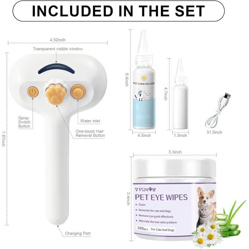 - You will receive 1 * Pet Steam Brush, 1 * Waterless Shampoo, 1 * Eye Wipes, 1 * USB Charging Cable, and 1 * Product Manual. If you are not sure whether the product is suitable for you, please let us know through our store homepage "Ask a Question" or support email. If you are not satisfied with the product for any reason, please let us know and we will solve the problem for you. We can even provide you with a new product - no questions asked!