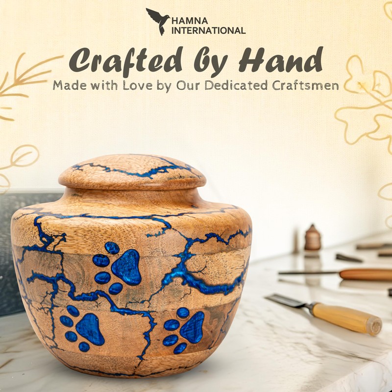 - MADE FROM PREMIUM SOLID MANGO WOOD: Crafted from high-quality, durable Solid Mango Wood Blue Paw Pet Urns for Dogs Ashes with a rich, natural grain for timeless elegance.
