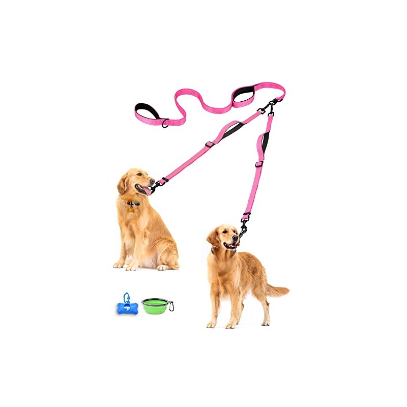 PetBonus Double Dog Leash, No Tangle Dual Dog Leash, Reflective Walking Training Leash, 4 Comfortable Padded Handles for 2 Dogs with Collapsible Bowl and Waste Bags Dispenser (Pink, Large)