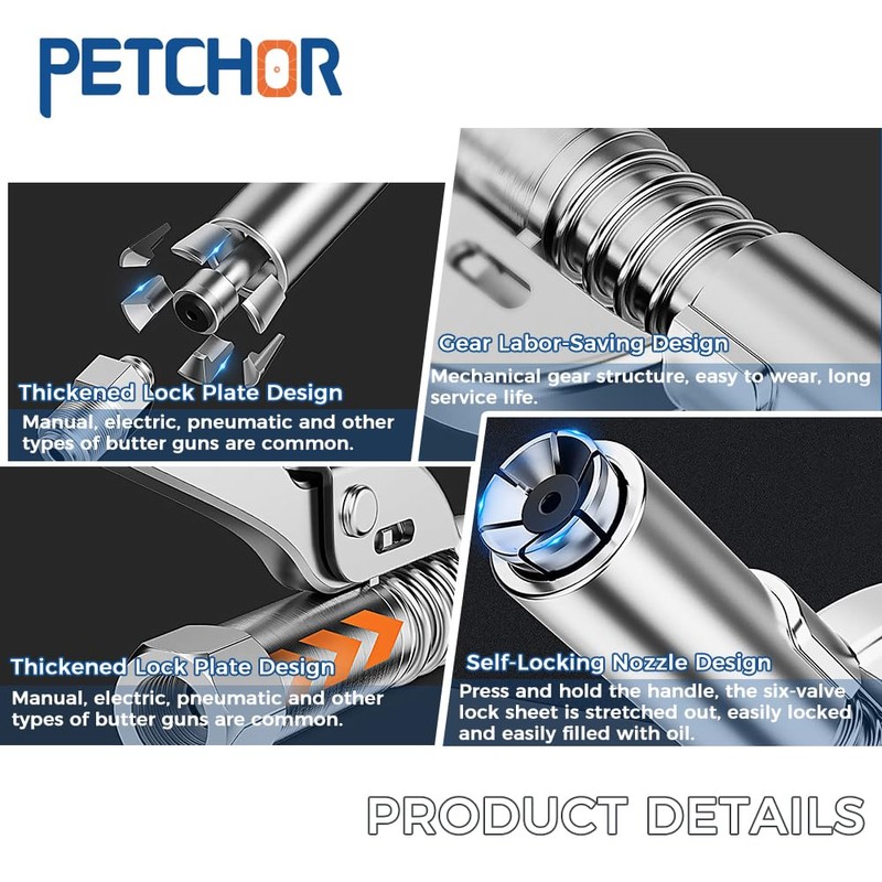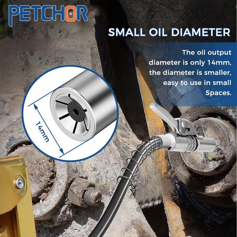 - 【SIMPLE OPERATION】: The locking grease gun connector has a locking nozzle and a thickened six-lobe lock piece. Press and hold the handle, the six-lobe lock piece is stretched out, insert the oil nozzle, release the hand and lock the lock piece, you can start to fill the oil. The oil output diameter is only 14mm, which is easy to use in small spaces. The handshaking is scientifically designed, and the pressing is effortless.