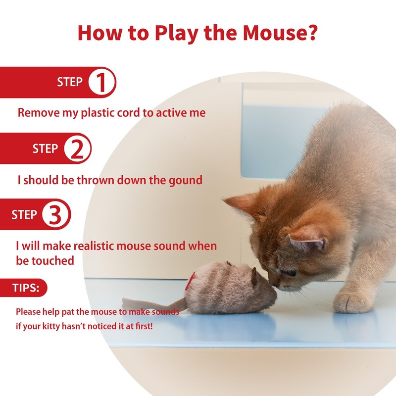 - SIMPLE USE: Take down the plastic cord of mouse sound cat toy to activate the chirpy cat toy and throw down the motion activated cat mouse toy to the ground to make a realistic mouse noise.