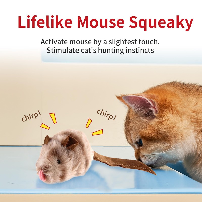 - CHIRPING MOUSE SOUND SQUEAKY: When touching lifelike mouse cat feather toys, activate internal squeaker with realistic chirping sound. Attract the cat's attention and stimulate the cat's natural instincts to hunt, pounce, kick and chase.