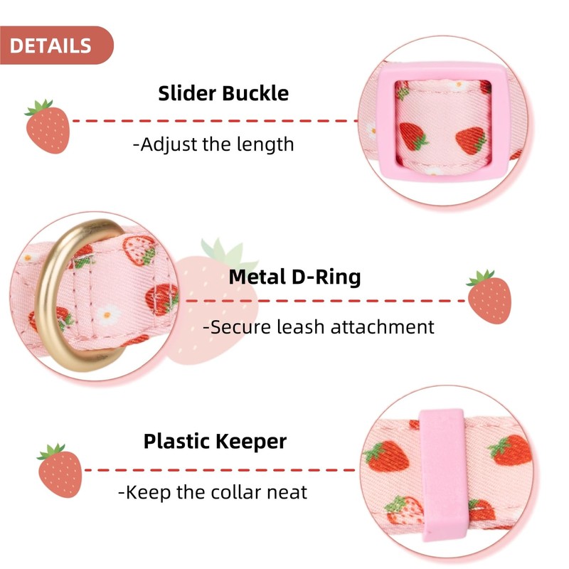 - Pretty in Pink: Adorned with a charming pink strawberry pattern, this accessory adds a sweet and playful touch to your pet’s look.