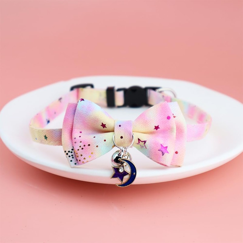 • Design & Style: Features a charming star pattern in pastel colors, adding a cute and fashionable touch to your cat's look. The attached moon charm with a star pendant enhances the overall aesthetic appeal.