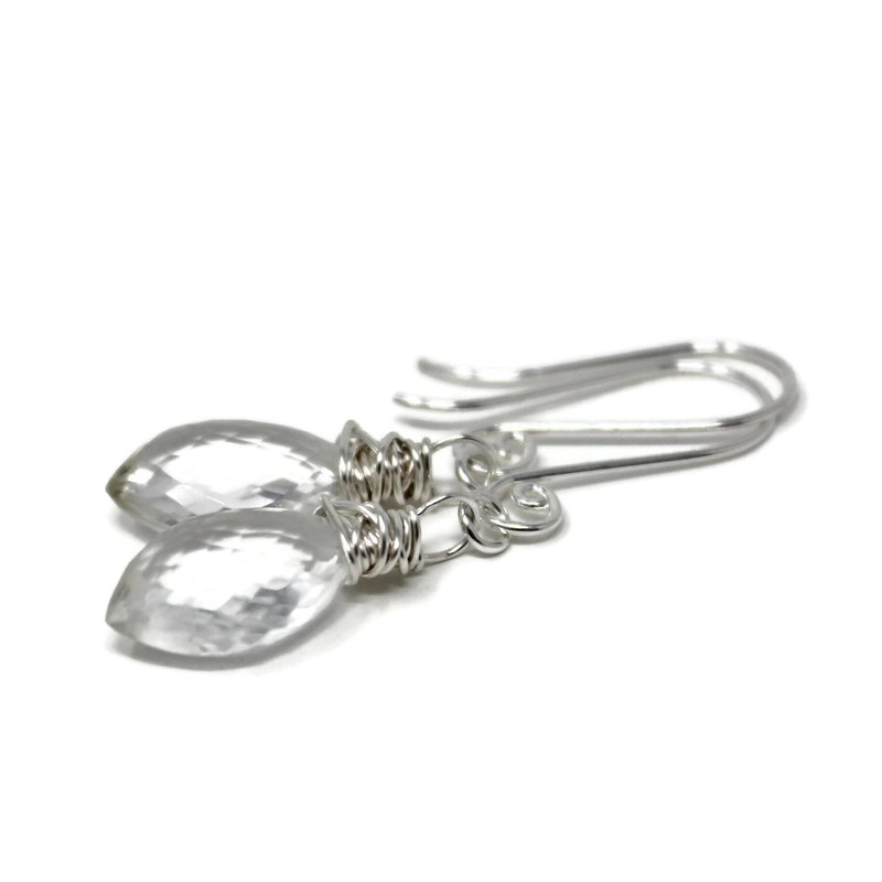 Petite Crystal Quartz Earrings Sterling Silver Dangling Drops Clear Faceted Stones Wire Wrapped