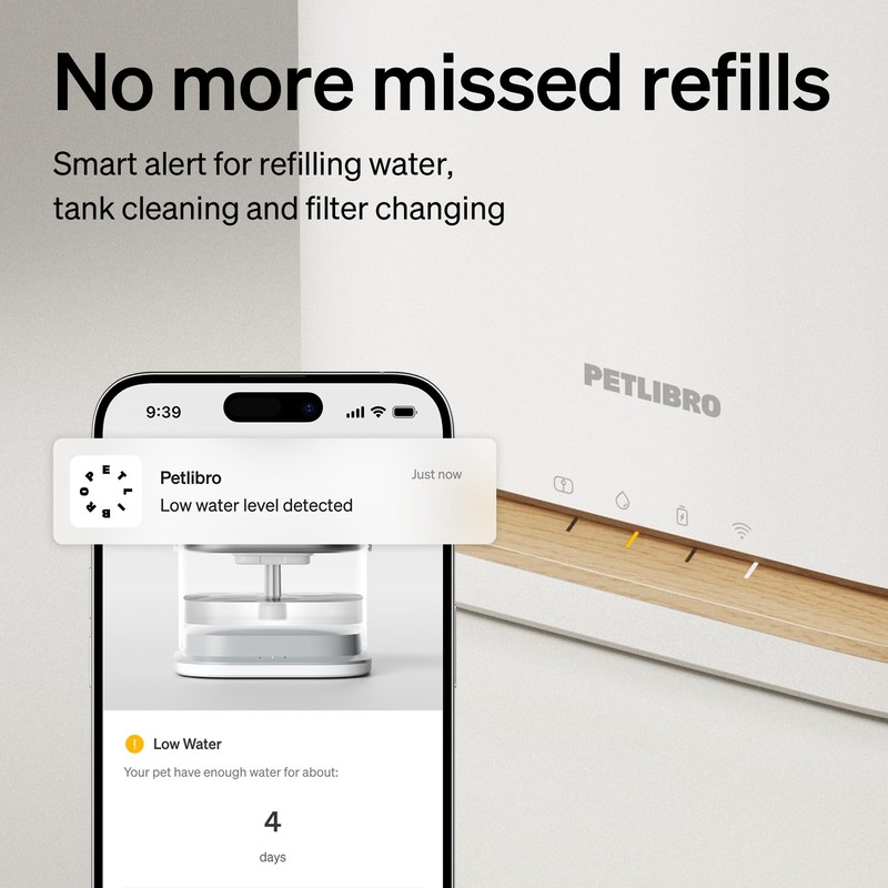 - Smart App for Total Peace of Mind: Eliminate dehydration worries. Our smart pet water fountain's app provides real-time water level monitoring and sends instant low-water alerts to your phone. You'll also get timely reminders for filter changes and cleaning, ensuring your cat always enjoys fresh, healthy water.