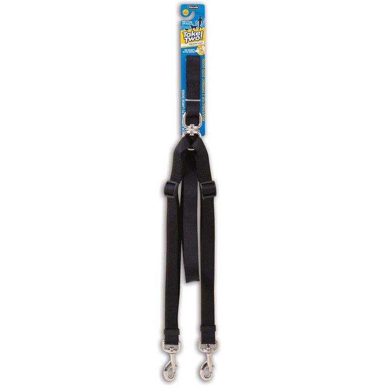 Take Two! makes walking two dogs at the same time a snap! The patented, Y-shaped dual dog leash features a tangle-free swivel joint that takes the frustrations out of walking two dogs at the same time. Choose from a standard handle or padded handle for added comfort. Two colors available as adjustable leashes, or couplers that can be added to any standard leash. Works with dogs of different sizes!.