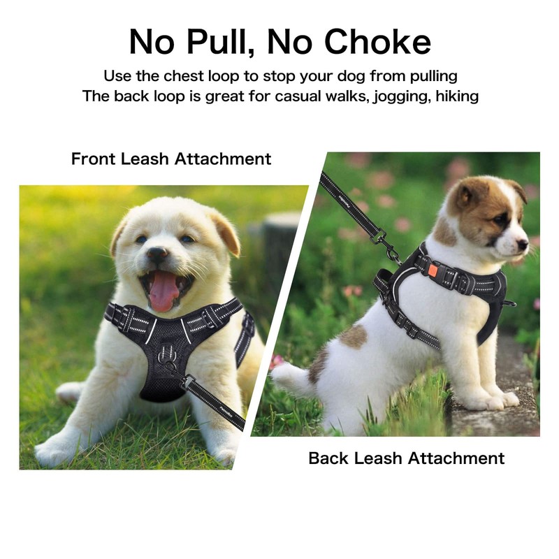 - [ Adjustable and Reflective ] The easy-on harness has 4 adjustable points, which create a secure fit. And slip-resistant straps mean the buckles will stay put after adjusting. The reflective strips on the harness making your dog more visible and the two of you safer during walks at night. The breathable material also won't trap heat, making it a great choice for both winter and summer walking, running, hiking, or even puppy training.