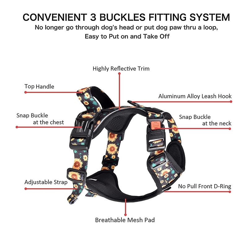- [Easy to Put on and Take Off] Petmolic no pull dog harness has 3 closures - 1 around the neck with a red security lock and 2 on each side of chest girth for ease of taking off and putting on. No longer have to go through dogs head and put dog paw thru a loop. Just put the logo side on the dog back, buckle it up with front legs on each side, adjust the straps, and here you go! It may take awhile to get adjusted properly first time, but once done, it is fairly easy to put on and off.