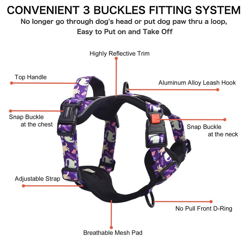 - [Easy to Put on and Take Off] Petmolic no pull dog harness has 3 closures - 1 around the neck with a red security lock and 2 on each side of chest girth for ease of taking off and putting on. No longer have to go through dogs head and put dog paw thru a loop. Just put the logo side on the dog back, buckle it up with front legs on each side, adjust the straps, and here you go! It may take awhile to get adjusted properly first time, but once done, it is fairly easy to put on and off.