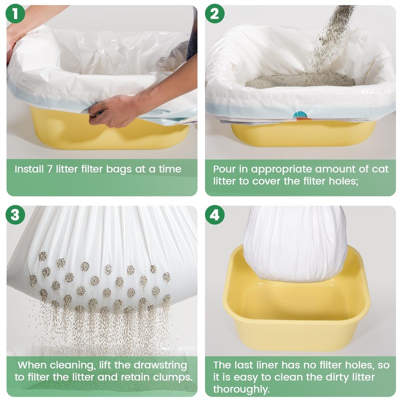 - 3. 7-Bag Weekly Hygiene System Each package contains 12 pre-filtered litter bags + 2 non-filtered utility litter bag, aligning with a 7-day litter maintenance routine. The non-filtered litter bag serves as a backup for storage or transport, ensuring seamless transitions between changes.