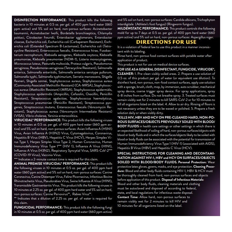 - Formulated for Use in Veterinary Clinic, Kennels, Grooming Salons, and other Animal Care Facilities - Kills Influenza Virus (H1N1) and (H3N2), Avian Influenza, Hepatits B and C, Canine Influenza, Salmonella, Parvo Virus, Staph, E. Coli, Bordetella Bronchiseptica, Adenovirus, Canine Distemper, Rabies, Herpes, and many more!
