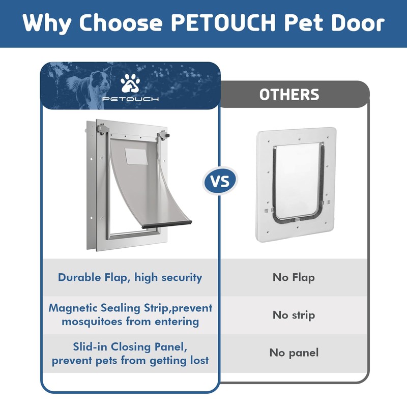 Energy-saving Flap: Petouch Dog Door features magnetic closure design to keep the flap in place. It effectively keeps dust, small insects, UV and extreme weather out.