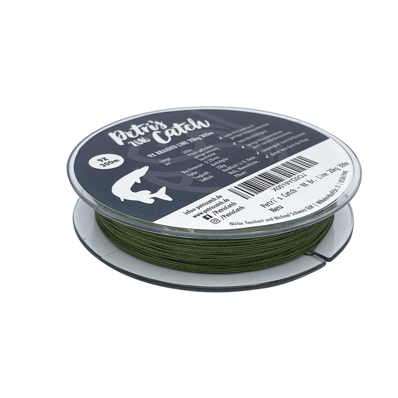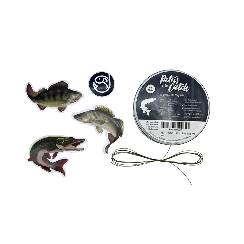 - Features: 300 m 9-flat braided predator line, 0.28 mm diameter, camouflaged dark green colour without fading, 20 kg load capacity, includes motif stickers pike, zander and perch