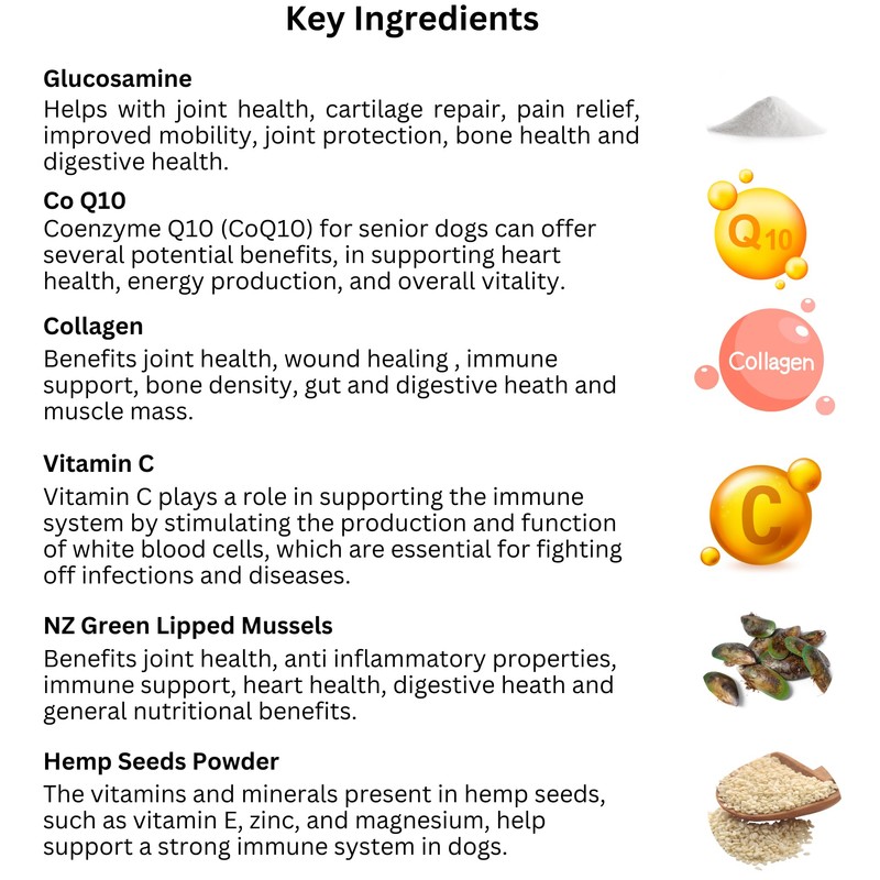 Quality Assurance: Premium, safe, and effective ingredients for senior pet's health.