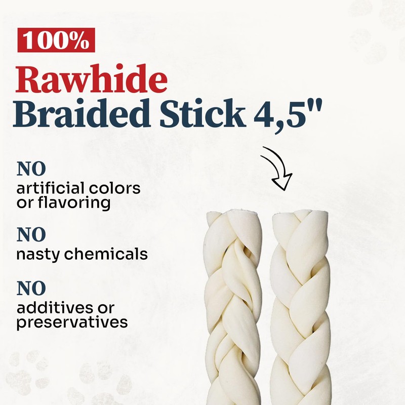 • Long-Lasting Chew: These 4-5" braided rawhide sticks offer an extended chewing experience for dogs seeking a delicious and satisfying treat.
