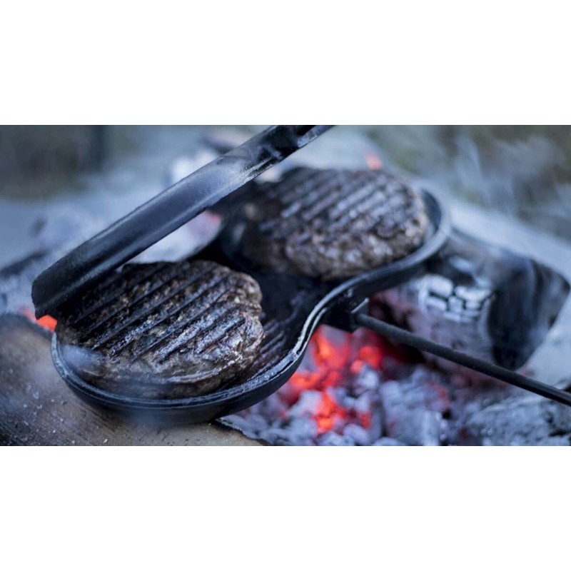 - The heat-storing material properties of the cast iron mold allow you to sear the burger patties in the fire and then cook them to perfection through the residual heat