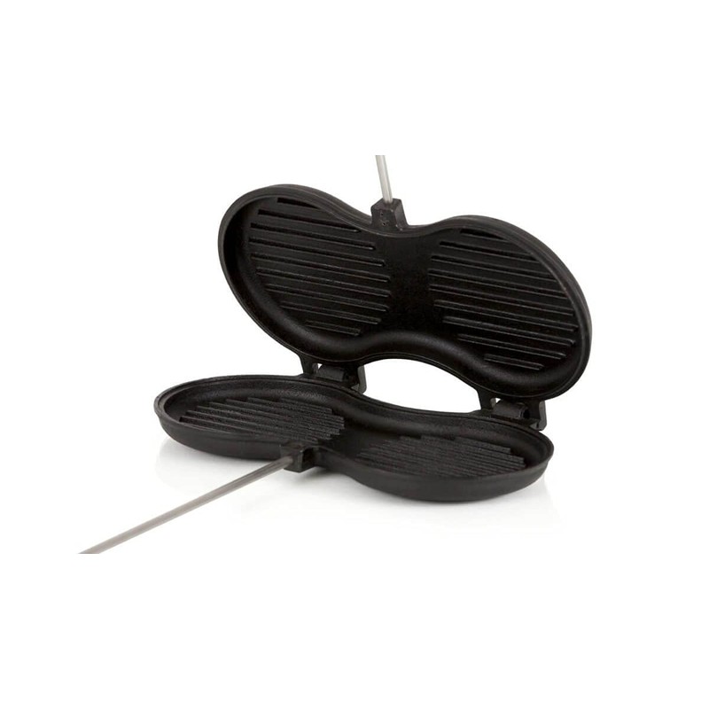 - hanks to the flat, flush wood handles and the locking hook, you can close and hold the burger iron safely into the embers