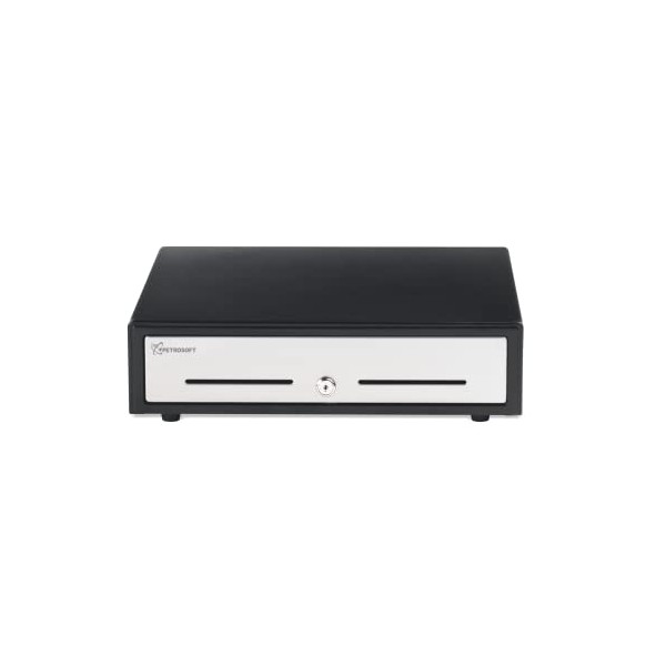 PETROSOFT 0410 POS Cash Register Drawer for Point of Sale (POS) System, 4 Bill 5 Coin Removable Cash Drawer Trays, Stainless Steel Front, Heavy Duty Black, 24V, 3 Position Lock, Media Slot, CD-0410