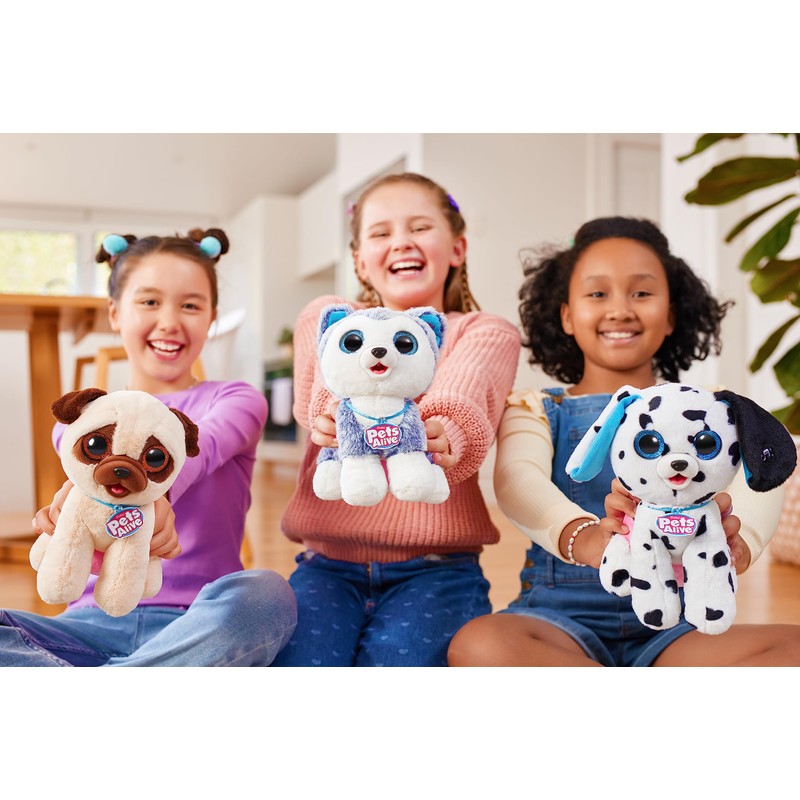 Uh oh! These Puppies have got to go! These adorable puppies are as real as it gets. They will cuddle you, bark for you and even eat like real puppies too. Once their tummies are full, they'll need to go! Watch them poop with color changing magic! Your new Pets Alive Pooping Puppy can't wait to become your new furry friend! There are 3 puppies to collect, will you adopt the pug, dalmation or husky?