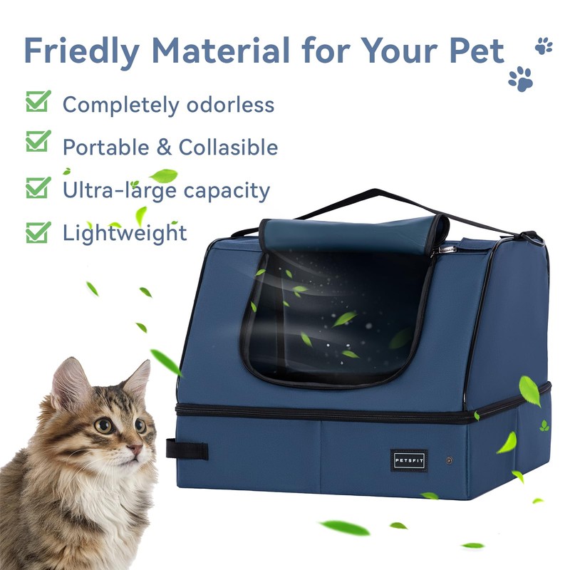 PETSFIT Travel Litter Box for Cats - Removable 2-Layer Leak-Proof Lining, Scratch-Resistant Fabric with Sturdy Support Frame, Cat Collapsible & Travel Litter Box Navy Blue