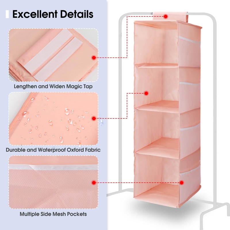 - Oxford Fabric: The hanging closet organizer is made of premium Oxford fabric, wear-resistant and durable. The bottom of each compartment is padded with the included paper base plate without deformation. The magic tap on the top is lengthen and widen for enhanced stability