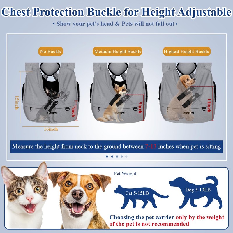 • MEASURE SIZE BEFORE PURCHASE: The size of small dog sling carrier is: 16"L x 15"W x 6.5"H, support pets with weight 5-15 lbs. The cat sling carrier chest is designed with two buckles, which not only protects your pet from falling off, but also can be adjusted according to your pet's height, so that your pet can always show its head for fresh air. If you want to be able to show your pet's head, please measure your pet's size from tail to neck between 7~13 inches when the pet is sitting.