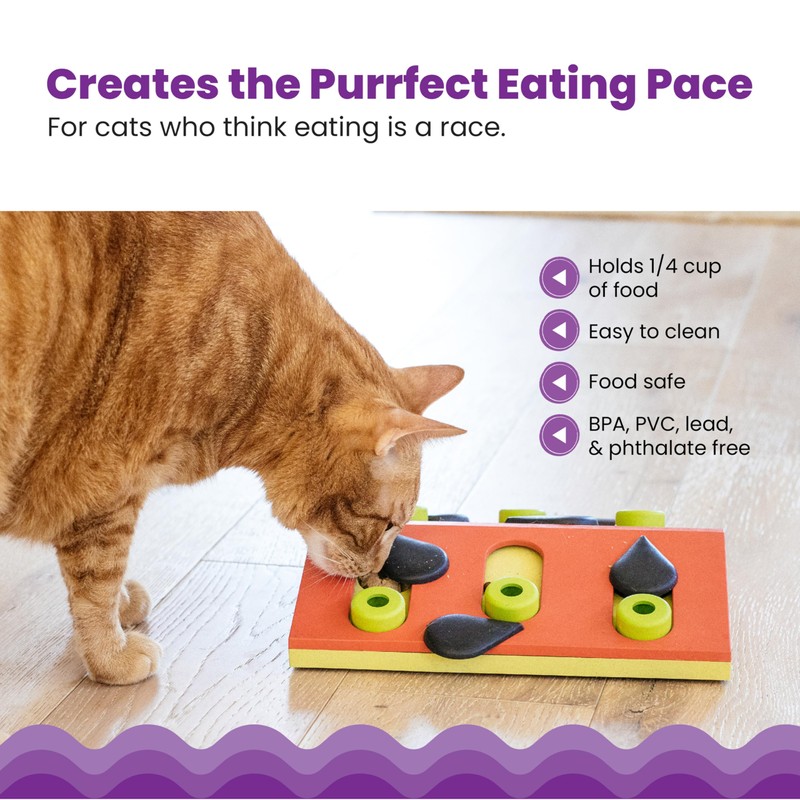 Your smarty cats will love the challenge of the Melon Madness Puzzle & Play by Nina Ottosson. Cats bat at the pegs and swivel the seeds to uncover the 6 hidden treat compartments. Adjust the difficulty of the puzzle to make it easier for beginners or more challenging for super smarty cats. Each puzzle comes with a Tips and Tricks info sheet to help you get the most out of your puzzle.Replace your standard bowl and feed your cat from the puzzle to engage their natural hunting and foraging instincts. The puzzle holds up to 1/4th cup of food, and is made with food safe materials that you can trust with your kitty.