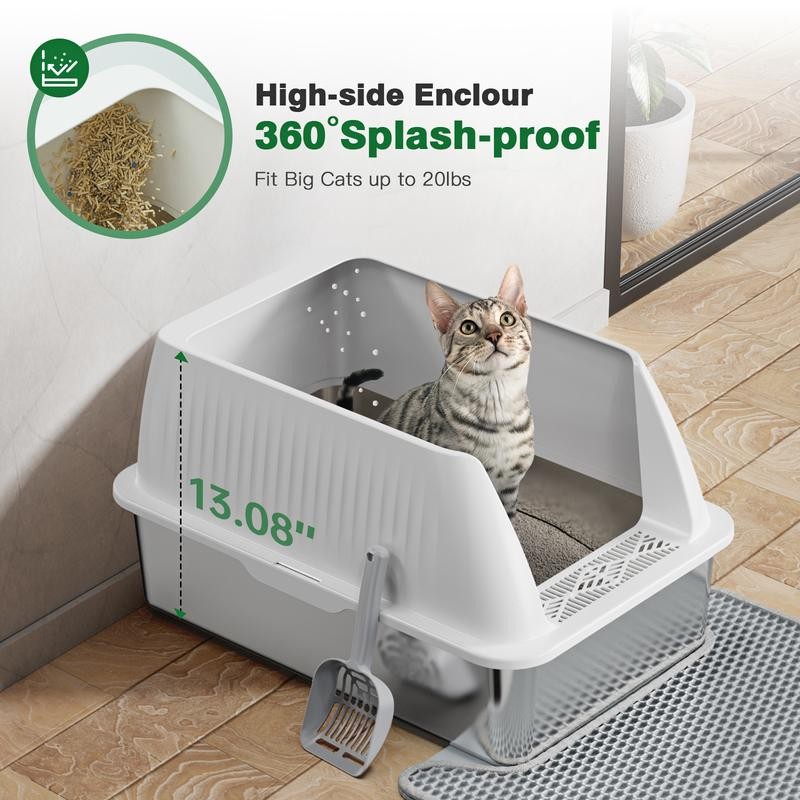 Petterm Stainless Steel Cat Litter Box with Scoop & Mat, Large Semi or Fully Enclosed Design, High-Side Enclosure, Non-Sticky, Anti-Leak, High-Walled - Color: White