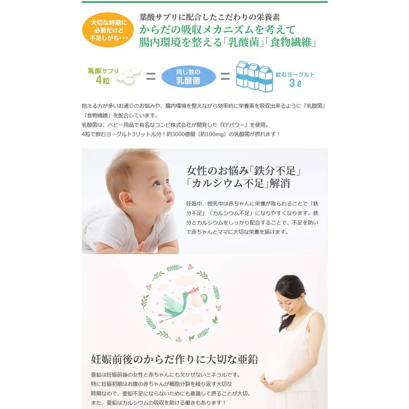 In addition to folic acid, it also contains lactic acid bacteria and dietary fibers, as well as calcium, iron, vitamin B6, vitamin 12, and zinc.