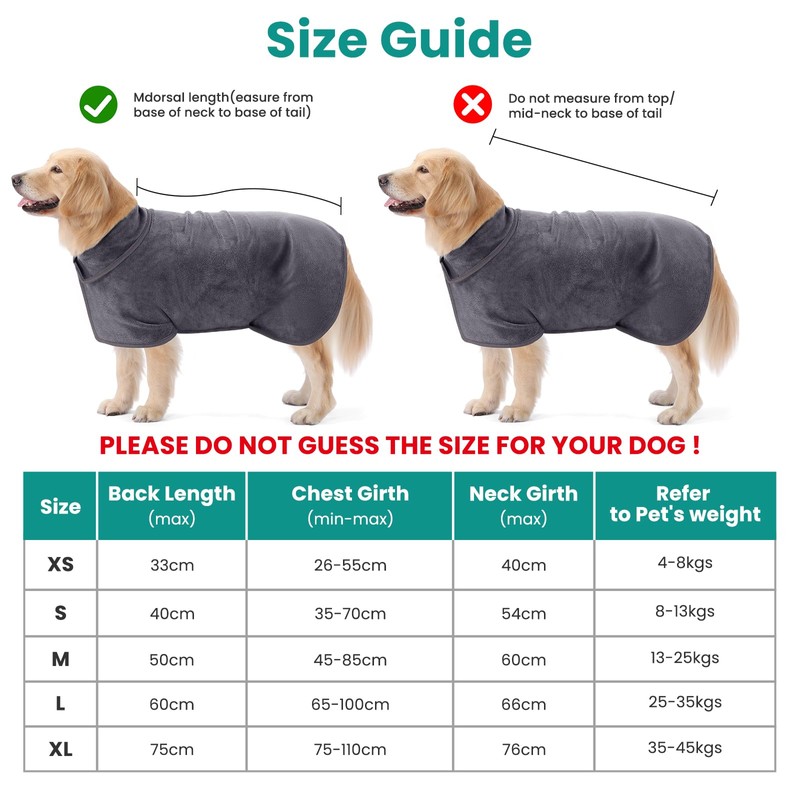 - SECURE FIT: Our bathrobes are available in 5 sizes (XS-XL) and fit great from small to large dogs, providing a comprehensive wrap for optimal protection and comfort.