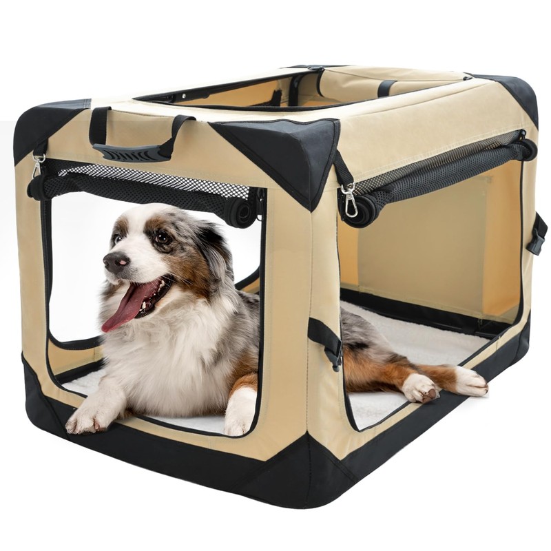 Pettycare 36 Inch Collapsible Dog Crate for Large Dogs, 4-Door Foldable Soft Dog Kennel with Chew Proof Mesh Windows, Indoor & Outdoor Travel Dog Crate, Beige