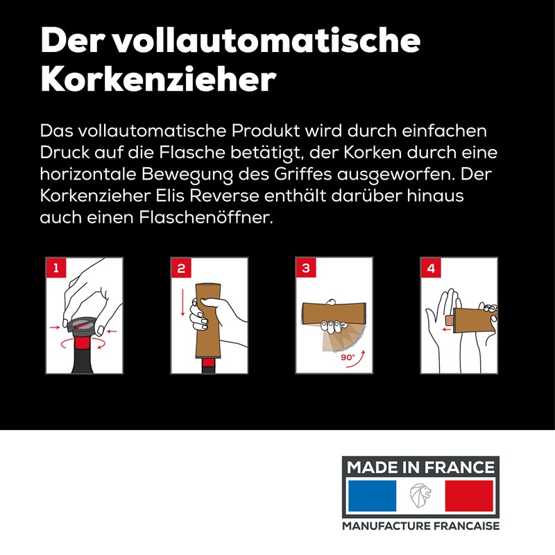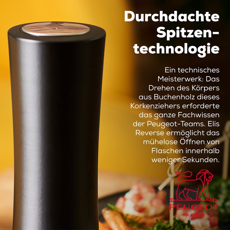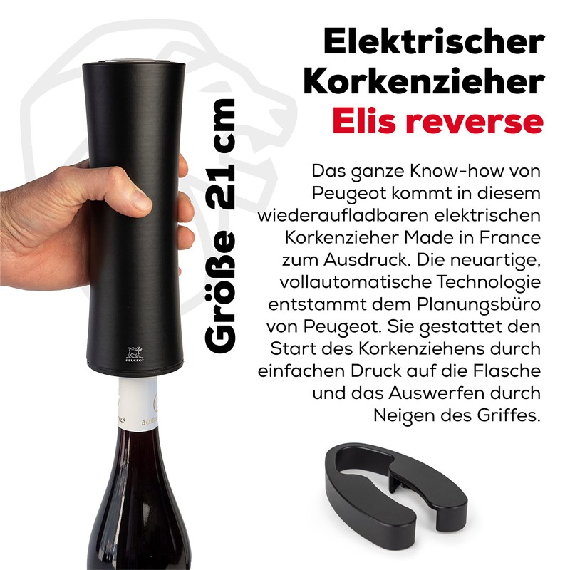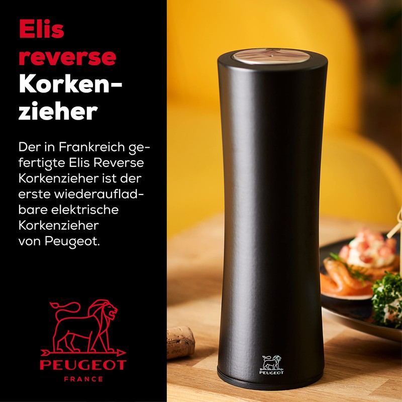 - ADVANCED CORKSCREW - Enhance those memorable moments with friends and family with the Elis Reverse electric corkscrew. The fully automatic technology is a creation of Peugeot's Design Department. Engineered and manufactured in France