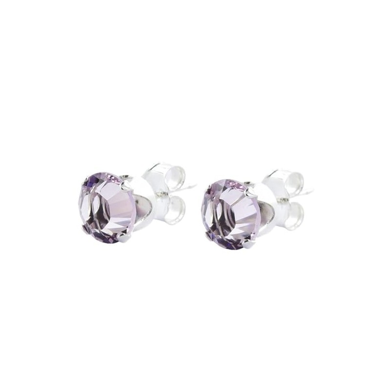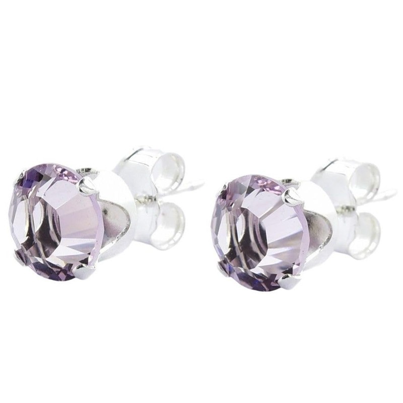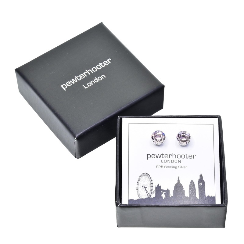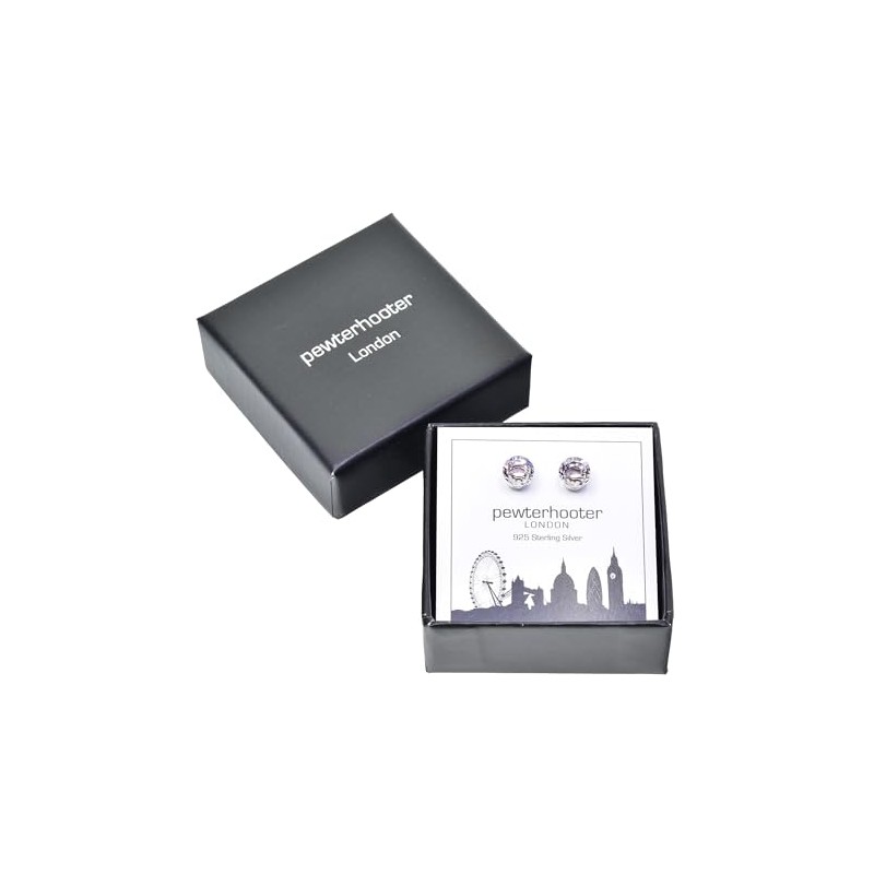 - pewterhooter London Collection stud earrings for women feature sparkling Light Amethyst Austrian crystal stones in a classic design. Each pair is made from sterling silver, measures 6mm x 6mm, and is stamped with '925.' They are presented in a beautiful gift box.