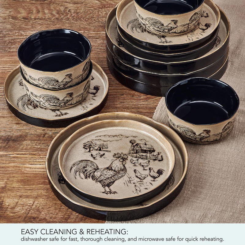 - CASUAL AND STYLISH: This Farmyard Rooster dinnerware collection adds a charming rustic touch to your table. Perfect for everyday meals or casual entertaining, it brings warmth and farmhouse style with its detailed, inviting design.