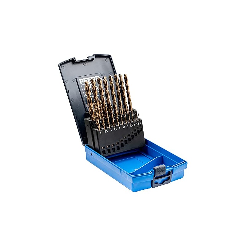 - Box contents: 1 x PFERD twist drill set. Consists of: 19 x twist drill bits / with diameter 1–10 mm (graduations 0.5 mm) and tip angle 135° / design INOX, HSS-E Co5 (M35).