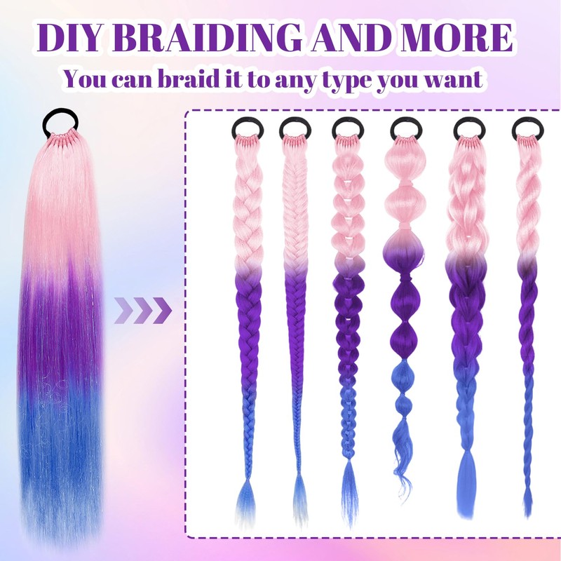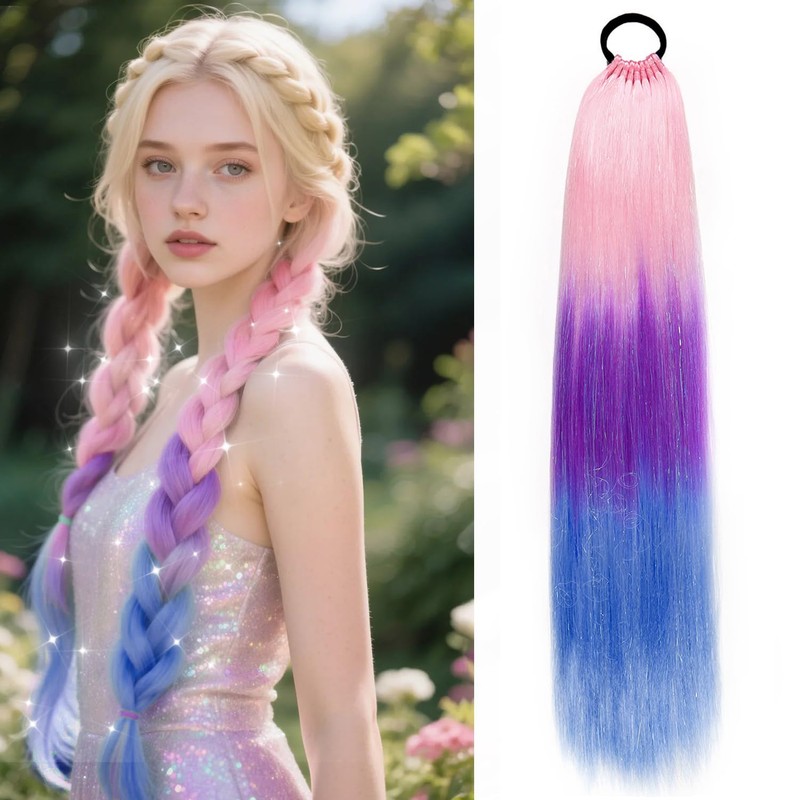 Pferdeschwanz-Extensions zum Flechten, 66 cm langes, gefärbtes Ombré-Kunsthaar mit Haargummi, Festival-Party-Haarteil (39 Stück)