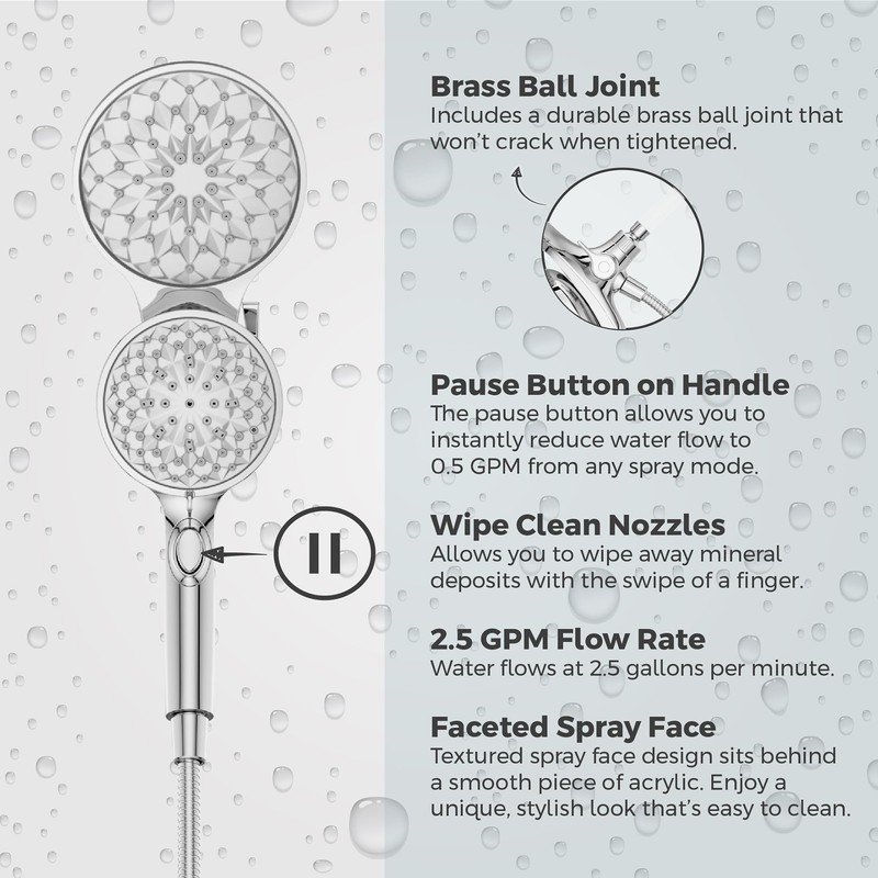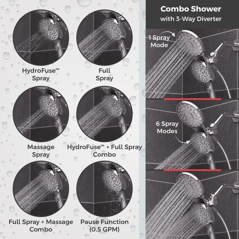 - MULTI-FUNCTION SHOWER HEAD – Includes 6 spray modes: Full Spray, Massage, Full Spray & Massage Combo, HydroFuse, Full Spray & HydroFuse Combo, and Pause; does not include shower arm (must purchase separately)