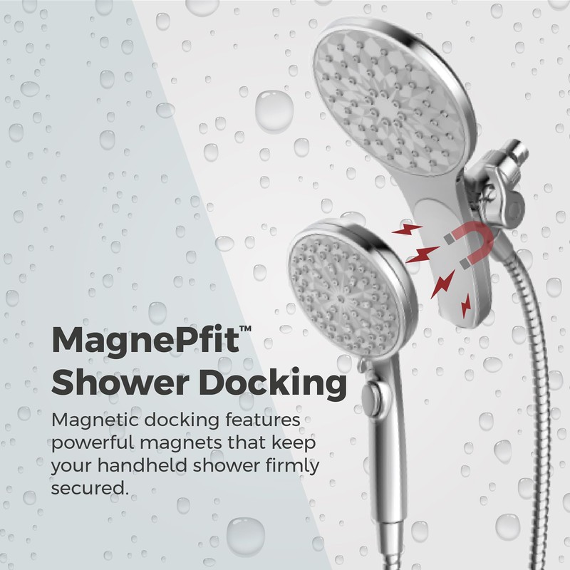 - MAGNETIC DOCKING TECHNOLOGY – MagnePfit magnetic docking features four powerful magnets that keep your handheld shower head firmly secured when not in use