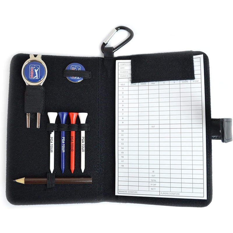 - Essential golf accessories included: divot tool, pencil, 4x 7cm wooden tees, 2x ball markers and scorecard. The accessories are fixed with elastic loops to keep them securely in place.