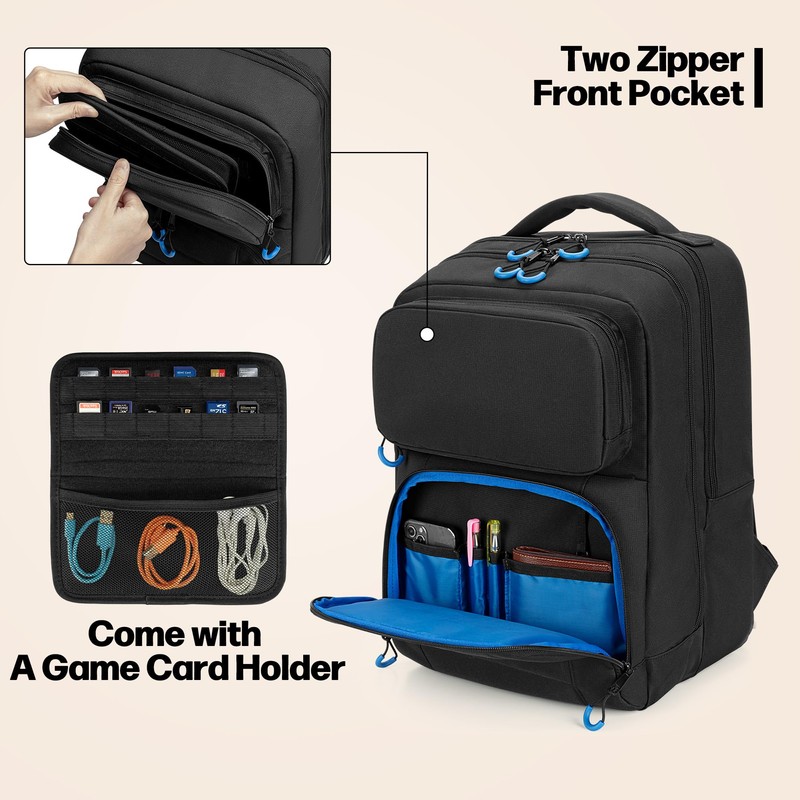 - ATTENTIVE STORAGE ROOMS: Top pocket features a separate game card holder with 24 game card slots and a mesh pocket, which allow you to carry your favorite games go to anywhere; And the down pocket has various slots for cell phones, wallet