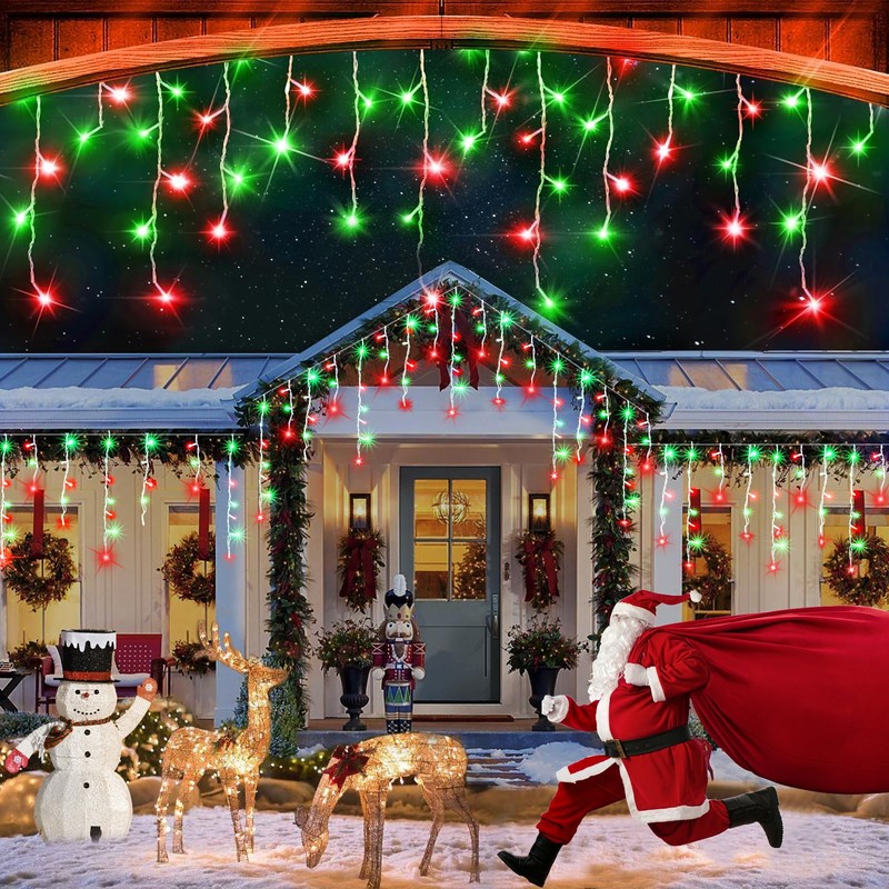 PgUp Christmas Lights Decoration Outdoor 124FT 1200 LED, Red and Green Ice Lgiths 8 Modes Timer Curtain Fairy Light with 240 Drops Plug in String Lights for Holiday Wedding Party