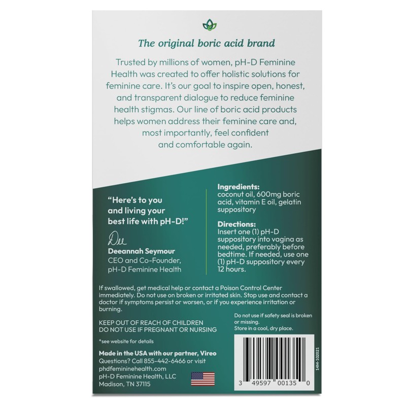 - A GAME CHANGER: pH-D's Boric Acid Moisturizing Suppositories are your go-to for a safe, effective, and holistic solution for vaginal odor and vaginal dryness.